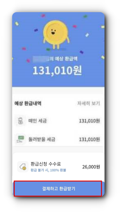 (1) 예상 환급액과 신청 수수료를 확인합니다. 결제하고 환급받기를 클릭합니다.