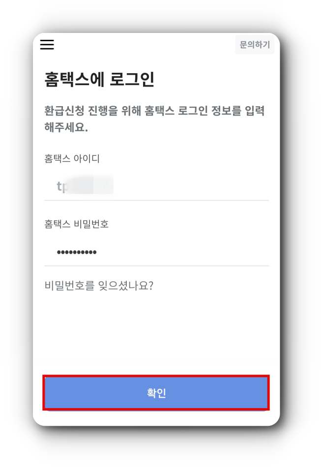 - 신청자를 대신해서 세무대리인이 환급신청을 진행해야 하기 때문에 신청자의 홈택스 아이디와 비밀번호가 필요합니다.
