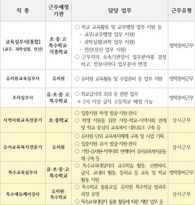 직종별 공통 사항으로 담당 업무, 근무시간, 장소 등은 배치 기관(학교)에 따라 기관(학교) 장이 정하게 됩니다. 또한 방학중 비근무자 경우 방학중에는 근무를 하지 않습니다. 월급 또한 지급되지 않습니다. 상시 근무자는 연중 365일 근무를 합니다. 자세히 확인하시고 지원하시길 바랍니다.